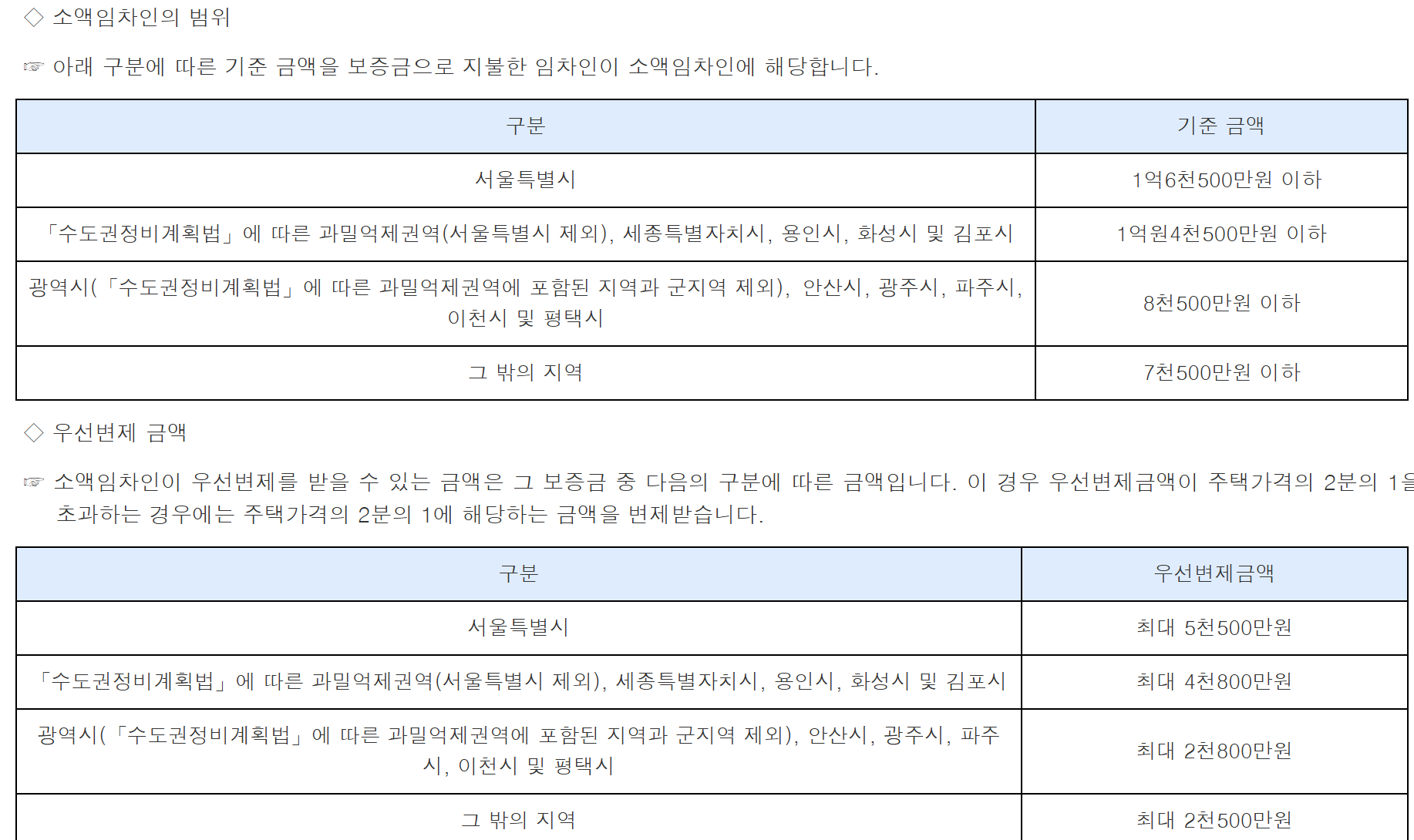 소액임차인 범위에 해당하는 보증금 중에 아래 표의 우선변제금액만 변제해주는 것이다.