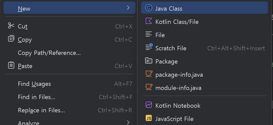새 파일을 생성하려 하자 친숙하게 Java Class 선택지가 뜬다